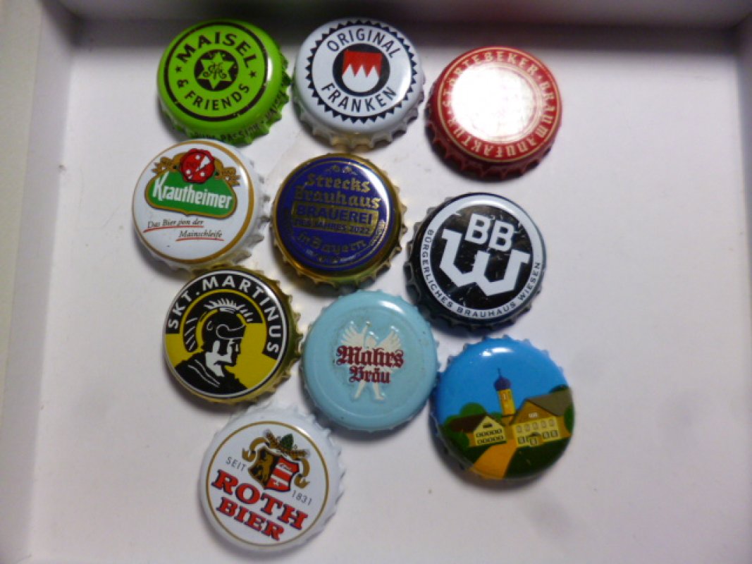 10 Stück, überwiegend aus Unterfranken bzw. Bayern, Gebrauchsspuren möglich, jedoch ohne typischen "Knick", da mit besonderem Flaschenöffner abgenommen.