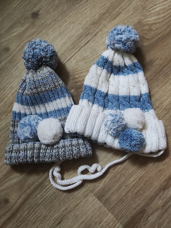 2 handgestrickte Bommelmützen mit 5 extra Bommeln