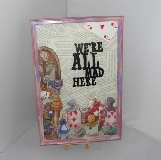 Das Bild ist in 3 Schichten gearbeitet. Der Hintergrund enthält Buchseiten aus dem Buch, auf das Glas wurde mit Arcylfarbe "We are all made here" geschrieben. darüber befidnet sich noch eine Bildschciht mit passenden Motiven aus einem Alice im Wunderland Kalender. Der Bilderrahmen wurde farblich passend gestaltet