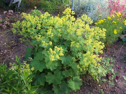 Hübsche mehrjährige Pflanze mit frischgrünen Blättern. Die zarten gelbgrünen Blüten stehen in lockeren Dolden und werden viel von Bienen besucht. Eine sehr auffallende Pflanze, die sich gut macht an einem Rand am Beet oder um Flächen zu füllen. Diese Staude kann man eigentlich mit allen Pflanzen gut kombinieren! Der Frauenmantel (Alchemilla mollis) gedeiht unkompliziert und stellt wenig Ansprüche.