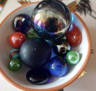 9 Kugeln, je 3 Kugeln in Durchmesser 6 cm, 4 cm und 2,5 cm.