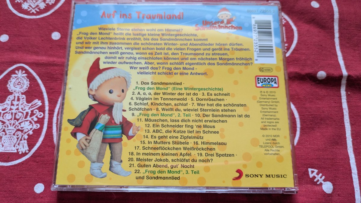 Empfohlen für Kinder von 3 bis 7 Jahren. Wie viele Sterne stehen wohl am Himmel? 'Frag den Mond' heißt die lustige kleine Wintergeschichte, die Volker Lechtenbrink erzählt, bis das Sandmännchen kommt und wir mit ihm zusammen die schönsten Winter- und Abendlieder hören dürfen. Und wer genau hinhört, vergisst schon bald die vielen Fragen und gerät ins Träumen. Sandmännchen weiß genau, wann es Zeit ist, den Traumsand zu streuen, damit wir ruhig einschlafen können und am nächsten Morgen fröhlich wieder aufwachen. Aber, wann schläft eigentlich das Sandmännchen? Wer weiß das? Frag den Mond - vielleicht schickt er eine Antwort.