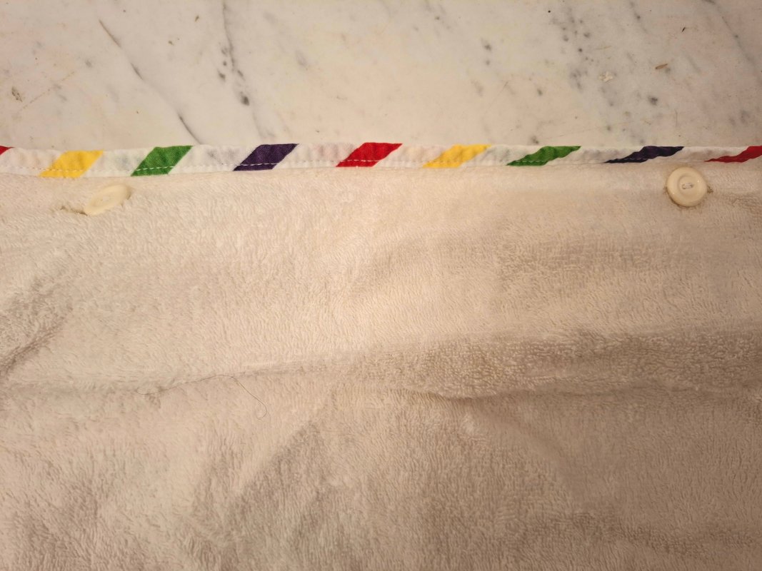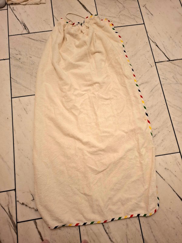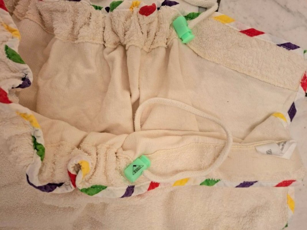 Grosses Frotteetuch zum Umziehen im Schwimmbad, wird mit Knöpfen, Klettverschluss und Kordelzug geschlossen. Darunter kann man dann die nassen Badesachen wechseln. Bei 60 Grad maschinenwaschbar.