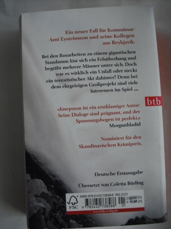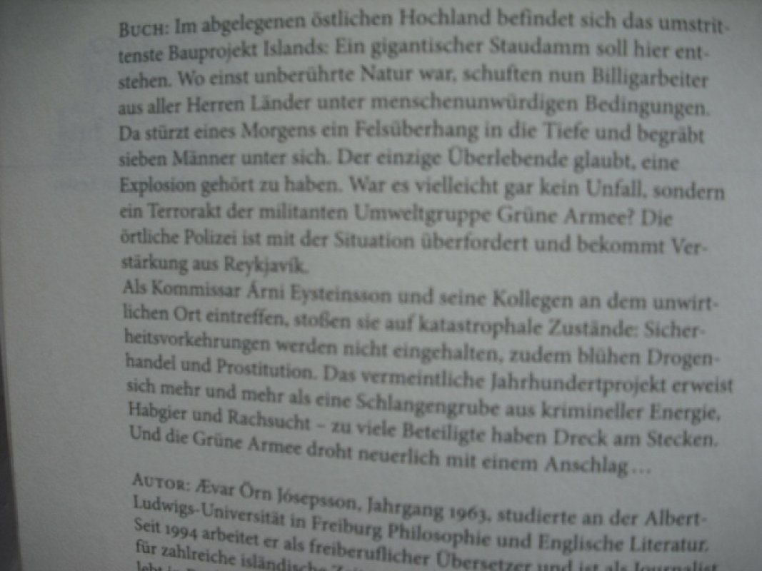 Ein neuer Fall für Kommissar Árni aus Reykjavík Im abgelegenen östlichen Hochland befindet sich das umstrittenste Bauprojekt Islands: ein gigantischer Staudamm soll hier entstehen. Wo einst unberührte Natur war, schuften nun Billigarbeiter aus aller Herren Länder unter menschenunwürdigen Bedingungen. Da stürzt eines Morgens ein Felsüberhang in die Tiefe und begräbt sieben Männer unter sich. Doch war es wirklich ein Unfall oder steckt ein grausamer terroristischer Akt dahinter? Als Kommissar Árni und seine Kollegen eintreffen, empfängt sie ein portugiesischer Arbeiter mit den Worten: „Willkommen in Alcatraz …“ Nominiert für den skandinavischen Krimipreis.