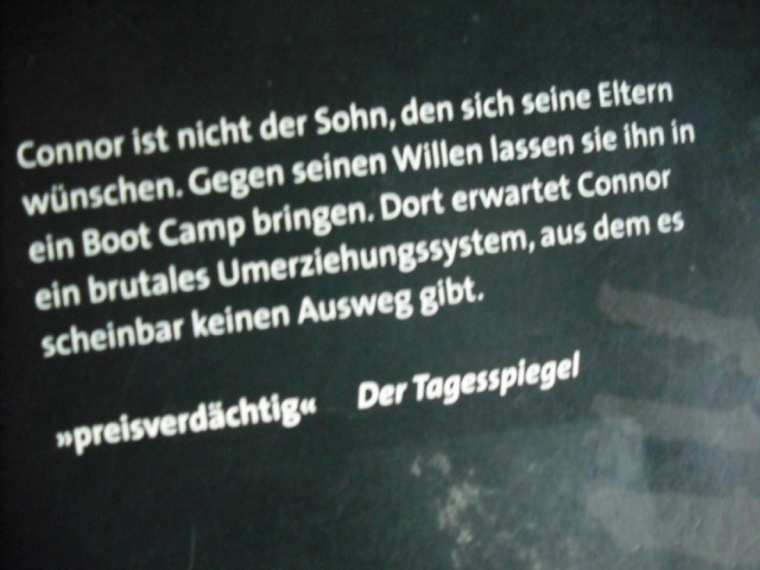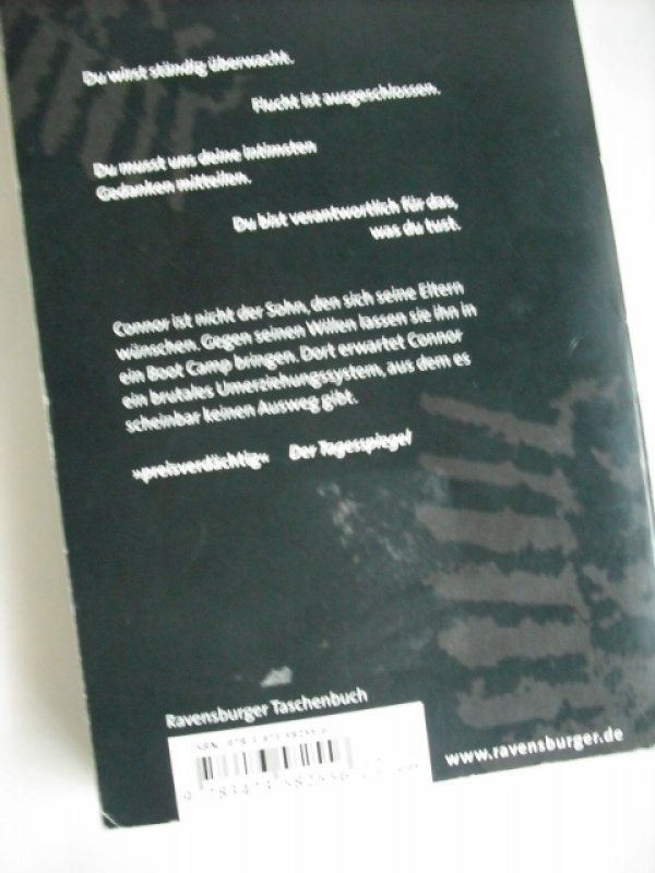 Verlagstext: Connors Eltern sind sich einig: Das Verhalten ihres Sohnes ist gesellschaftlich inakzeptabel. Gegen seinen Willen wird der Sechzehnjährige in ein Boot Camp gebracht. Dort erwartet ihn ein brutales Umerziehungssystem. Es gibt nur einen Ausweg: Flucht. Wichtig für den Schulunterricht: Seitenzählung unverändert!Mitten in der Nacht wird der sechzehnjährige Connor entführt und in ein Auto gezerrt. Es stellt sich schnell heraus, dass diese Aktion von seinen Eltern in Auftrag gegeben worden ist, um ihn, den unangepassten Jugendlichen, gegen seinen Willen in ein Boot Camp zu verfrachten.Da Connor eine Beziehung zu einer zehn Jahre älteren Frau führt und das nicht den Vorstellungen seiner Eltern entspricht, haben sie ihn für viel Geld in „Lake Harmony“, einem Umerziehungslager für schwer erziehbare Teenager, angemeldet. Dort soll er auf den vermeintlich richtigen Weg geführt werden. Connor erwartet im Boot Camp die Hölle. Körperliche Züchtigung, Isolierstation und verbale Demütigungen gehören zum Alltag. Schließlich findet Connor in Pauly und Sarah zwei Gleichgesinnte und gemeinsam gelingt es ihnen, aus dem Boot Camp zu fliehen. Doch zwei Aufseher sind den Freunden dicht auf den Fersen. Und plötzlich steht Connor vor einer schweren Entscheidung …