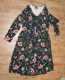 Dunkelgrünes Jersey-Kleid in Wickeloptik, Blumendruck all-over. Bequeme Schlupfform ohne Reißverschluss und ohne Taschen. dehnbar, daher auch größer tragbar