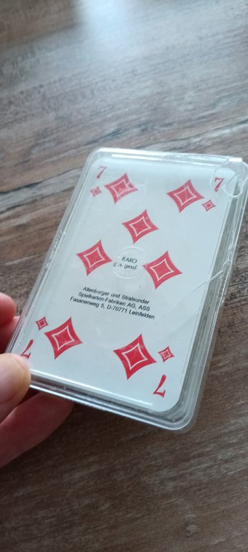 Das Kartenspiel ist vollständig, die Karten in einem guten Zustand- die Plastikhülle ist allerdings beschädigt.