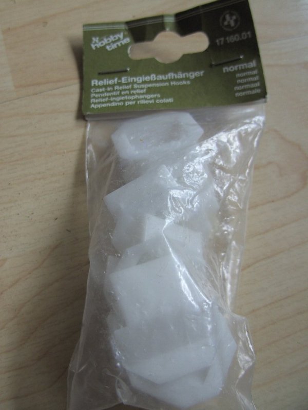 Es handelt isch um Relief - Eingießaufhänger normal von hobby time. Im Päckchen sind sechs Stück vorhanden. Wir haben auch noch ein zweites Päckchen, das wir gerne bei Bedarf mit dazulegen.