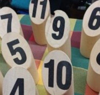 Großes Holzkegelspiel mit nummerierten Kegeln, insgesamt 10 Token