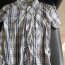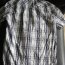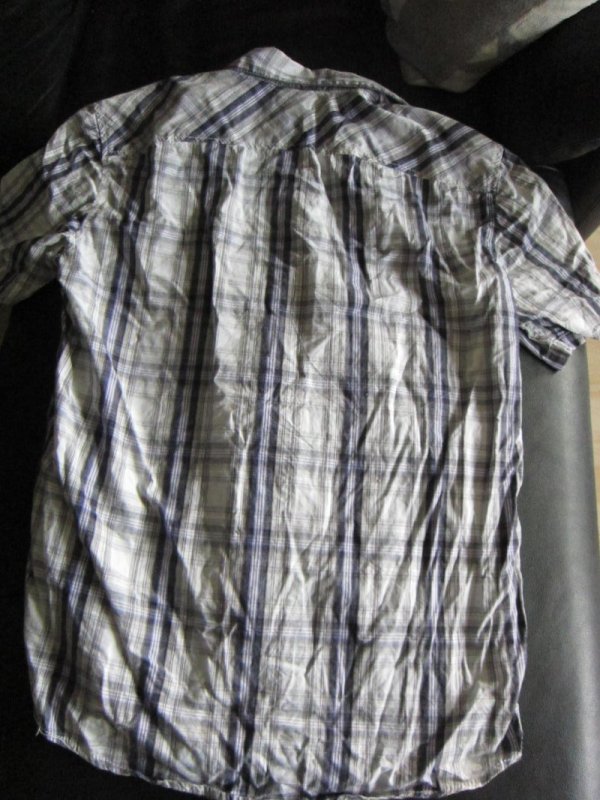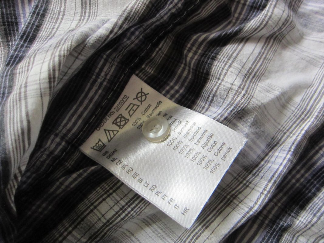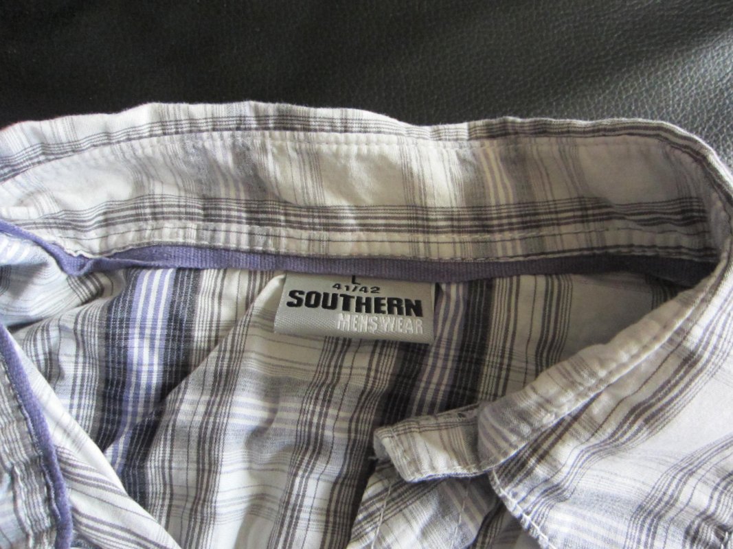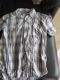 Das Hemd ist kariert in den Farben weiß, schwarz, grau und lila. Es hat eine Brusttasche links und kurze Ärmel. Die einfache Brustweite ist 50 cm und die Gesamtlänge 68 cm. Das Hemd ist aus 100 % Baumwolle und ein Ersatzknopf ist auch noch vorhanden. Die eingetragene Kragengröße ist 41/42.