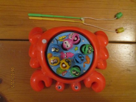 Kleines Angelspiel zum Aufziehen für zwei Personen. Die Fische sind ganz witzig und öffnen ihr Maul, leider ist das Spiel recht laut und muss öfter aufgezogen werden, daher 2:1. Bei Anforderung für 2 Token für andere Sachen gerne auch 2:1. Achtung: Teelicht dient nur zum Größenvergleich und ist kein Teil des Angebots