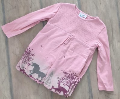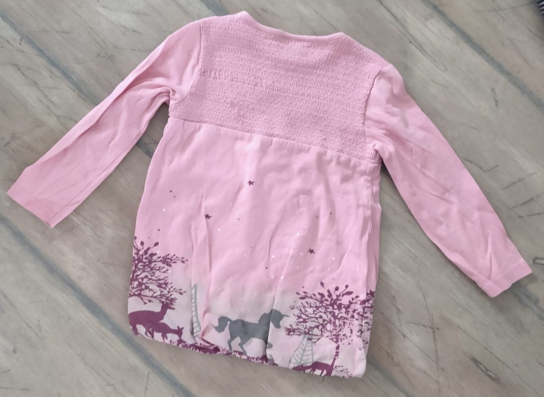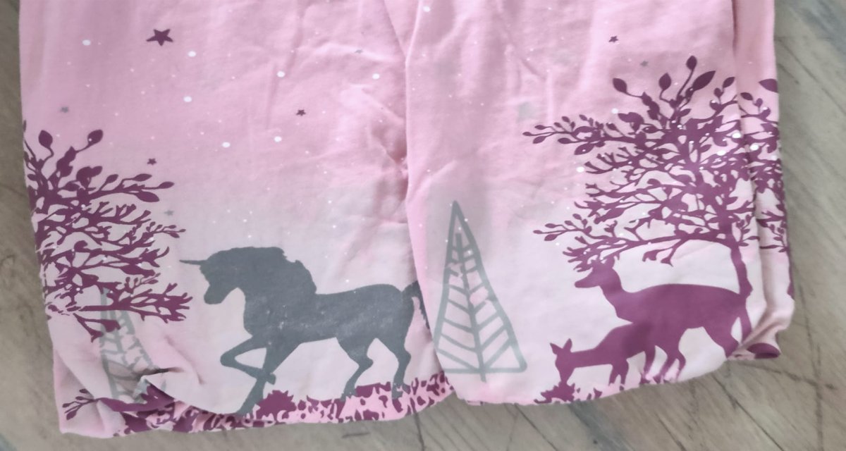 Das Shirt ist grundsätzlich in einem guten gebrauchten Zustand. Der Einhorn-Druck ist ganz leicht rissig. Es sind ein paar Gummis gezogen, insbesondere am Rücken.