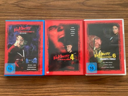 3 DVDs der Nightmare on Elm Street Reihe. Obwohl auf allen Covern FSK 16 Logo, sind die Teile 2 und 4 laut DVD FSK 18 (siehe Fotos), daher hier auch als FSK 18 eingestellt ...