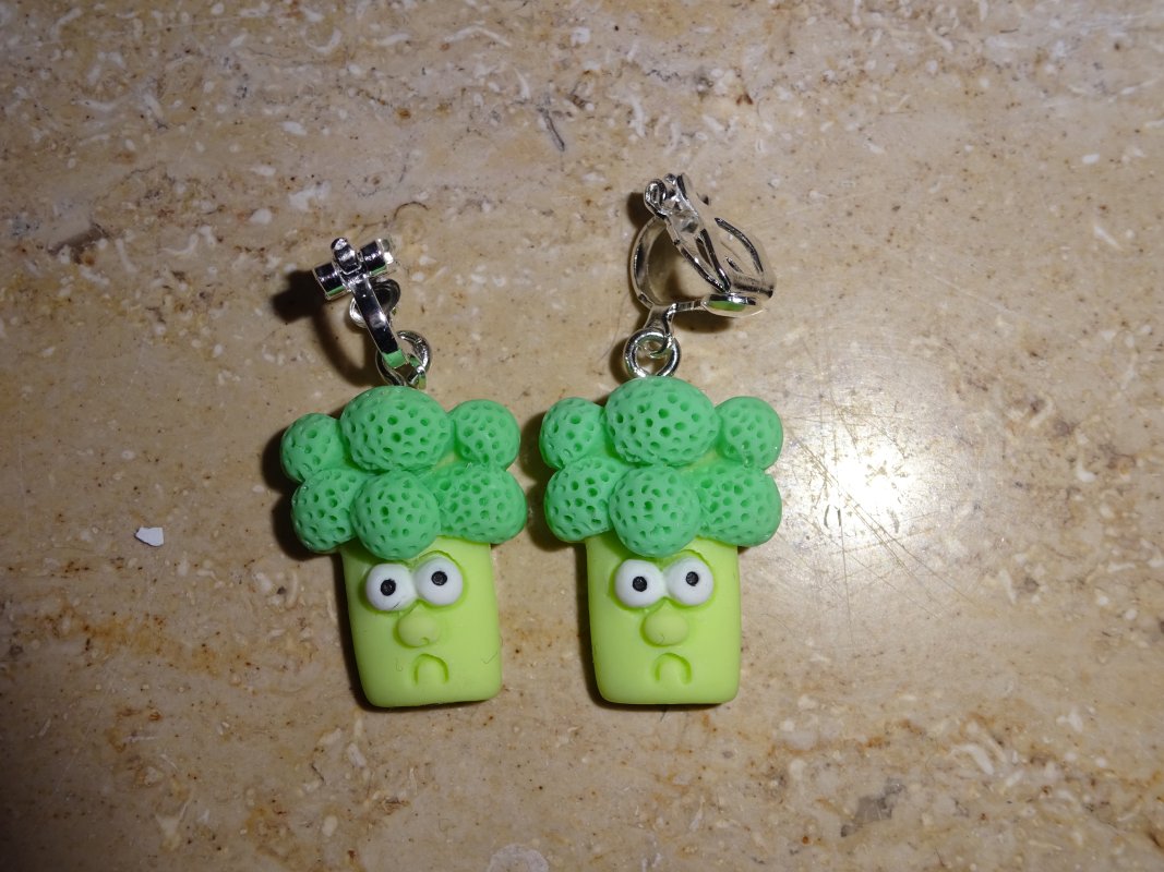 Ohrclips mit Brokkoli, insgesamt ca. 3,5 cm lang. Zum Tragen sind keine Ohrlöcher erforderlich, der Schmuck wird einfach ans Ohrläppchen geklippst.