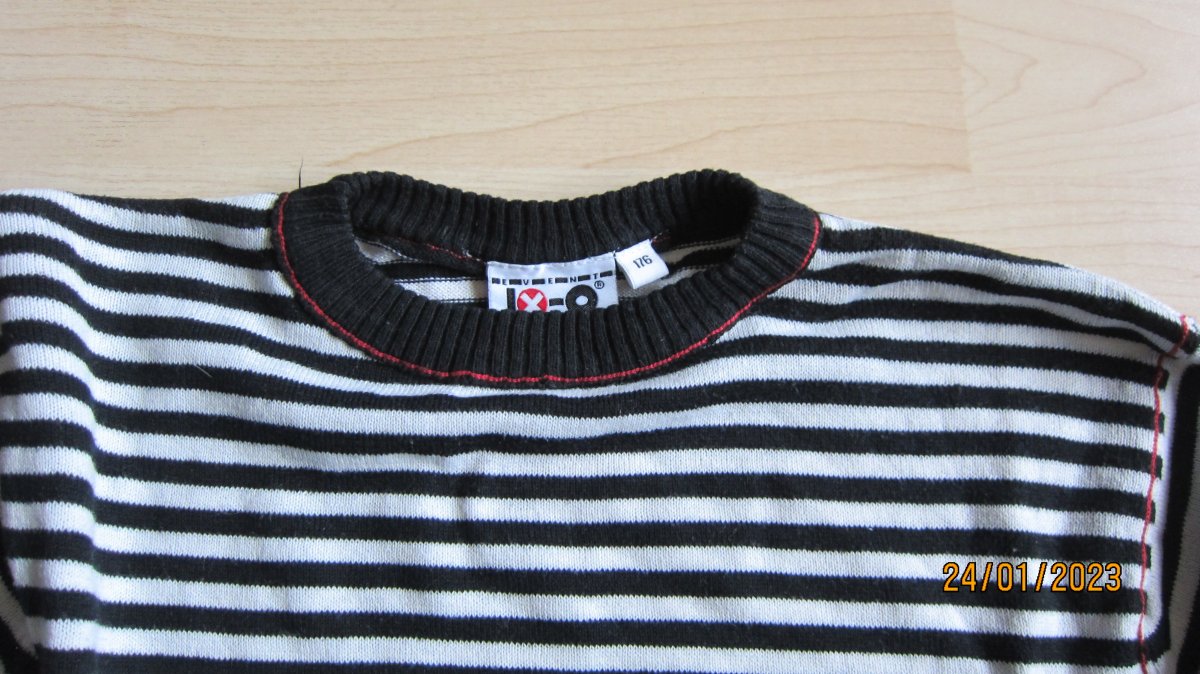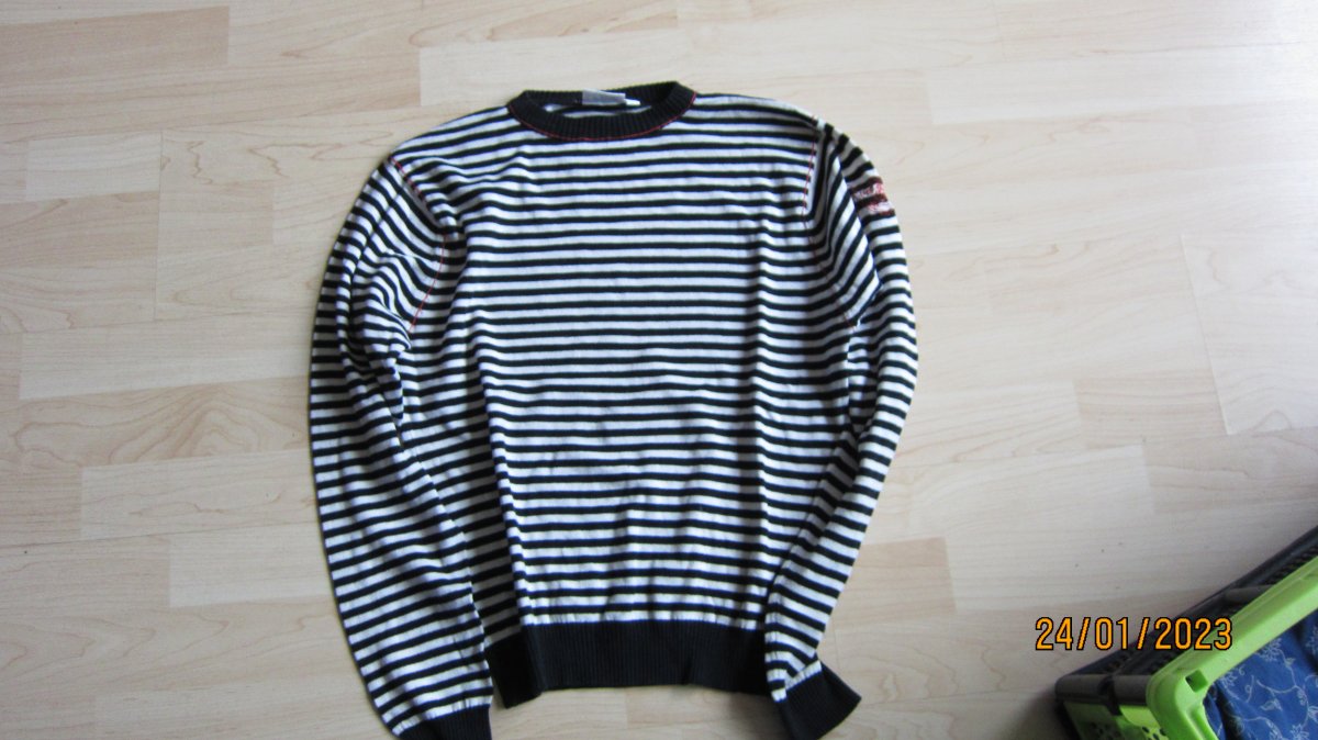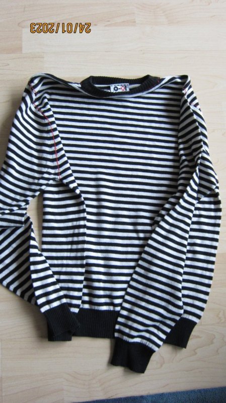 Die eingetragene Größe ist 176, war meiner Tochter zu kurz, daher nur einal getragen. Daher habe ich auch die Gr. kleiner angegeben. Beachten sie die Maße. Die einfache Brustweite unter den Ärmeln gemessen ist 45 cm und die Gesamtlänge ab der Schulter 54 cm. 50 % Baumwolle und 50 % Acryl. Rote Ziernaht an den Ärmeln und auf dem linken Armel ein Wappen mit Flügeln in rot aufgestickt.
