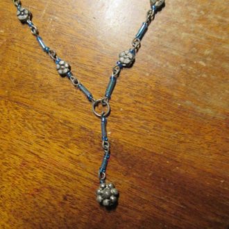 kleine silberfarbene Blümchen - dazwischen kleine Stege die hellblau schimmern - Verschluß funktioniert nicht mehr richtig und müßte erneuert werden - Länge 38 cm + Verlängerung