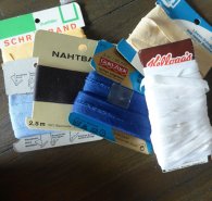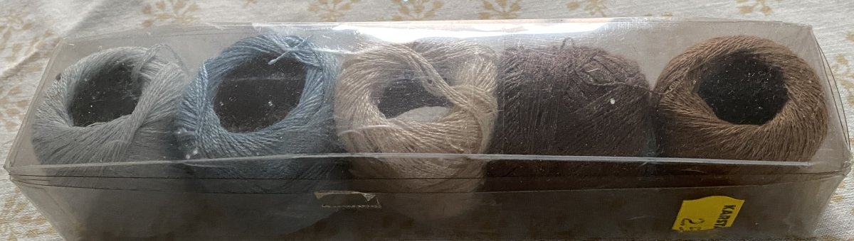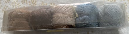 Stick- oder Häkelgarn - da bin ich nicht so sicher - in verschiedenen Farben. Beinahe alle schon nicht mehr komplett. 'Erbstücke' von meiner Mutter,sie hat gerne Taschentücher und/oder Mull-Waschläppchen (für's Enkelchen *gg*) umhäkelt, ich vermute mal, mit diesem Garn.