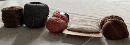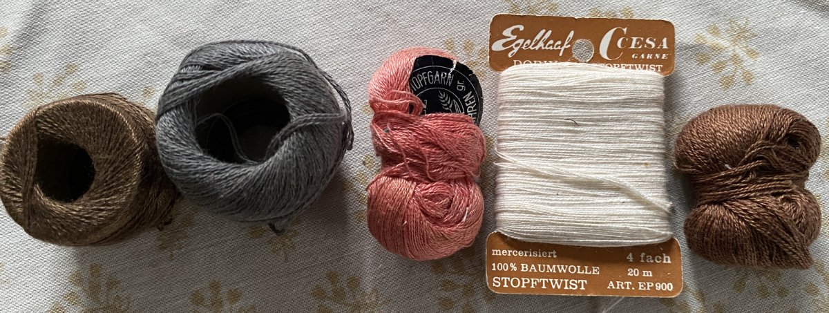 Stick- oder Häkelgarn - da bin ich nicht so sicher - in verschiedenen Farben. Beinahe alle schon nicht mehr komplett. 'Erbstücke' von meiner Mutter,sie hat gerne Taschentücher und/oder Mull-Waschläppchen (für's Enkelchen *gg*) umhäkelt, ich vermute mal, mit diesem Garn.