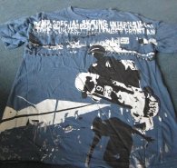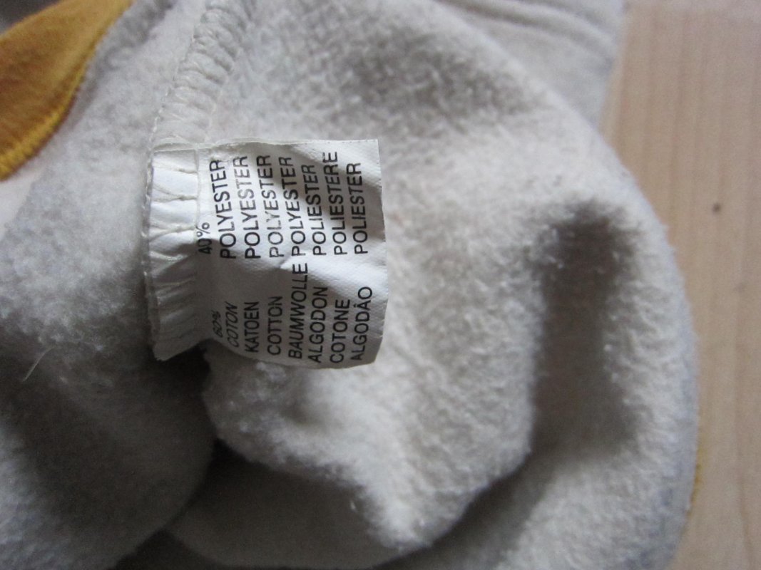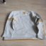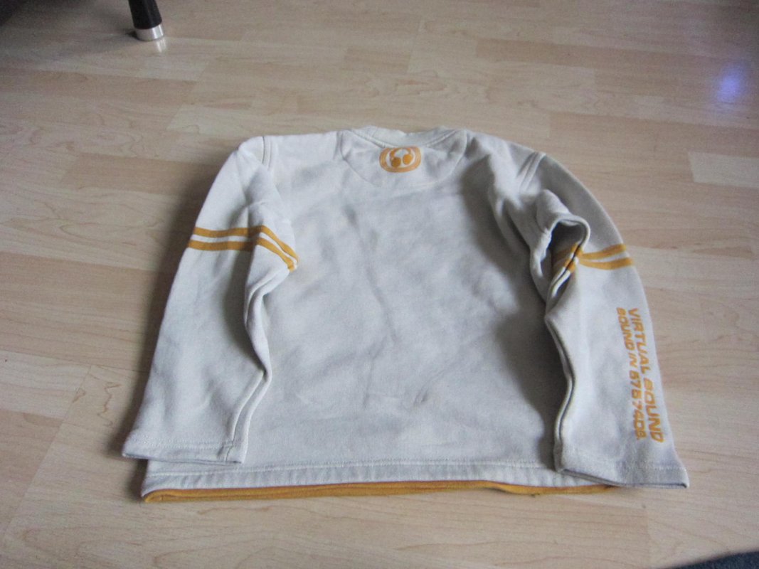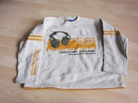 Es handelt sich um einen hellen beigen Pullover mit Doppellagenlook am Bund in orange. Vorne ist ein großer Aufdruck mit Kopfhörer und hinten im Nacken in klein. Sowie mit Schrift vorne und auf dem linken Ärmel.
